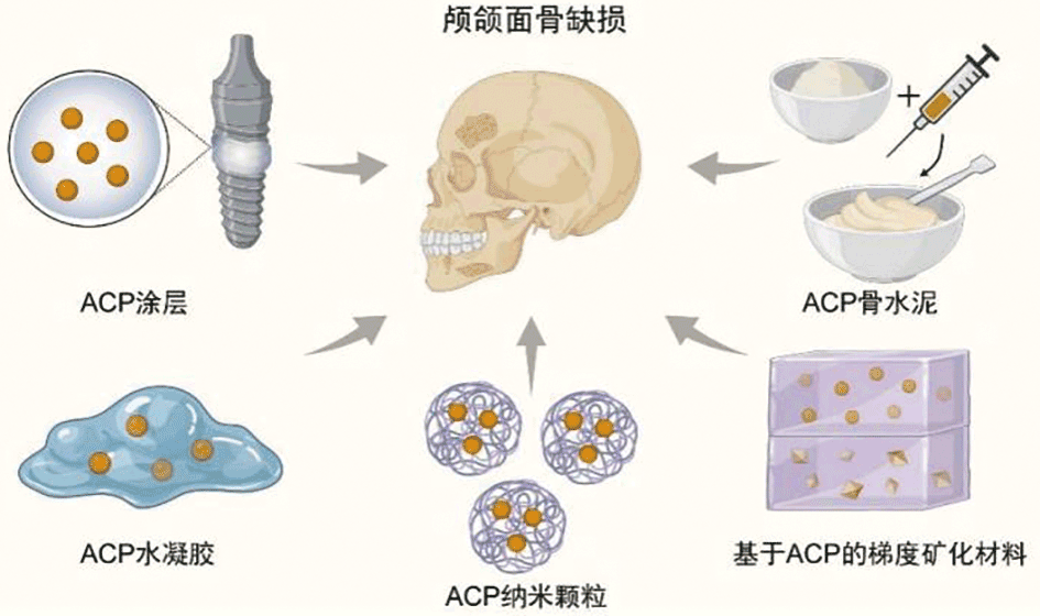 Craniomaxillofacial bone defects exhibit high incidence rates and significantly impair patients’ quality of life. Effective reconstruction of these defects is crucial for functional rehabilitation and improved survival prognosis. As a key precursor in bone mineralization, amorphous calcium phosphate(ACP) exhibits exceptional bioactivity, plasticity, and controllable degradability, offering unique advantages in establishing mineralized microenvironments and promoting bone tissue regeneration. This review summarizes the biological mechanisms that regulate the stability and crystallization behavior of ACP, with a particular focus on its applications in various biomaterial systems, including coatings, bone cements, hydrogels, nanoparticle platforms, and gradient mineralization constructs. It aims to provide a theoretical basis for the broader clinical translation of ACP-based biomaterials.