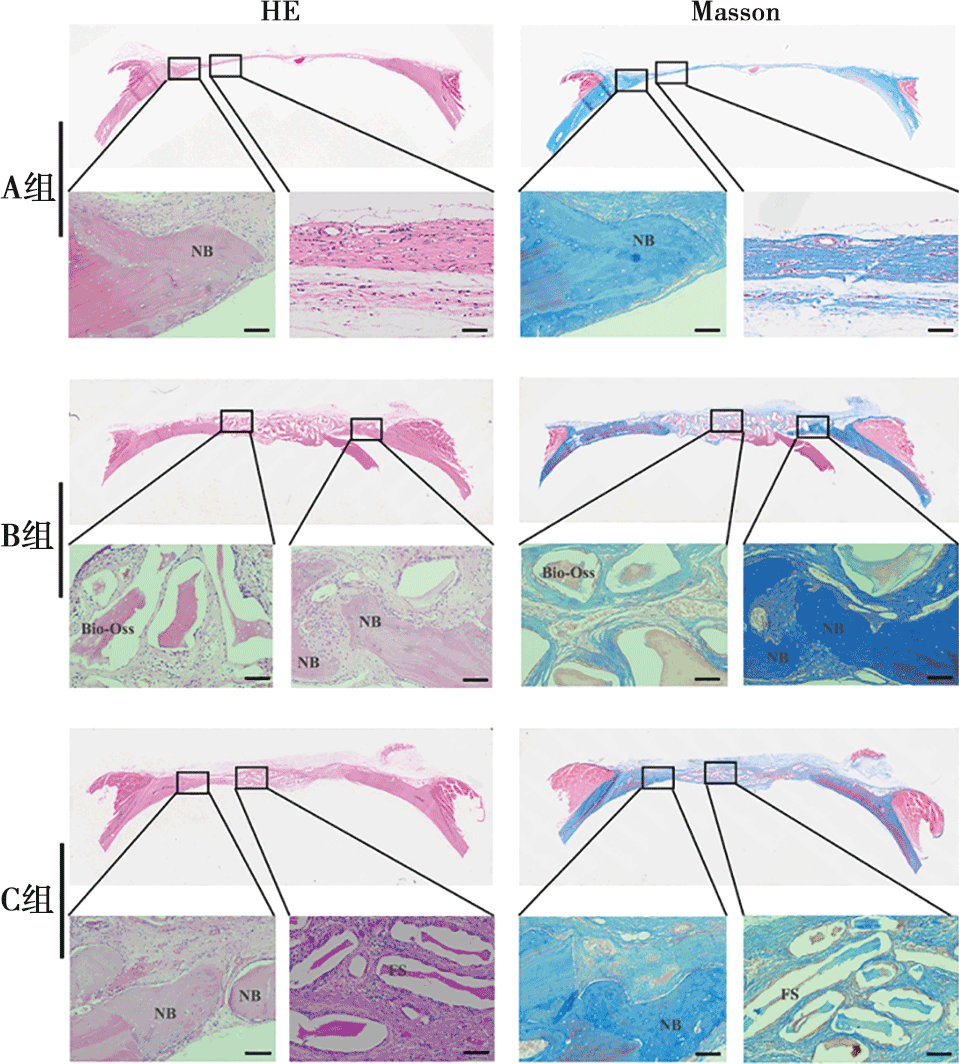 目的 观察并比较鱼鳞(fish scale,FS)骨粉及Bio-Oss骨粉的细胞毒性、促成骨分化能力及体内修复大鼠颅骨缺损作用。方法 制备FS骨粉,Bio-Oss骨粉作为阳性对照,扫描电子显微镜观察FS骨粉微观结构,活/死细胞染色和CCK-8检测12.5~200.0 mg/mL Bio-Oss和FS浸提液的细胞毒性。Bio-Oss骨粉(Bio-Oss组)和FS骨粉(FS组)分别与大鼠骨髓间充质干细胞(bone marrow mesenchymal stem cells,BMSCs)共培养,RT-PCR检测细胞成骨相关基因ALP、RUNX2、OPN表达,茜素红染色观察成骨矿化能力;将两种骨粉分别植入大鼠颅骨临界缺损模型,通过Micro-CT、HE染色及Masson染色观察术后8周骨再生效果。结果 FS骨粉直径为200~800 μm,正面呈瓦楞状,背面较平滑,形态不规则。50 mg/mL及以下浓度的Bio-Oss和FS浸提液无细胞毒性;Bio-Oss及FS均可促进BMSCs钙化结节形成及成骨相关基因(ALP、RUNX2及OPN)表达(P<0.05),且FS组RUNX2、OPN表达水平显著高于Bio-Oss组(P<0.05)。植入Bio-Oss骨粉和FS骨粉后,Micro-CT分析发现,大鼠颅骨缺损处新生骨骨体积分数(bone volume tissue volume,BV/TV)明显增加(P<0.05);HE及Masson染色结果显示Bio-Oss组和FS组骨再生量也明显提高。结论 FS骨粉具有较好的细胞相容性及促成骨分化能力,在大鼠体内骨再生效果与Bio-Oss相似,应用前景广阔。
