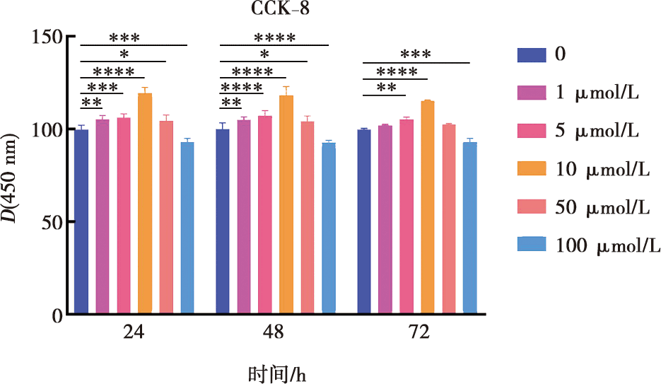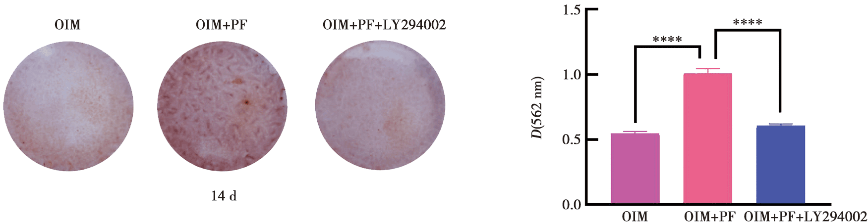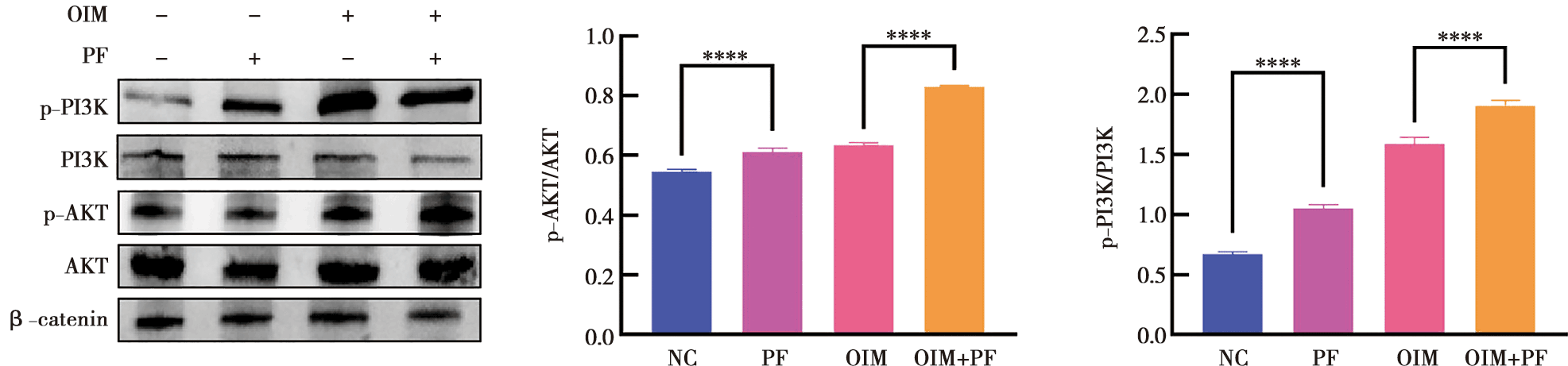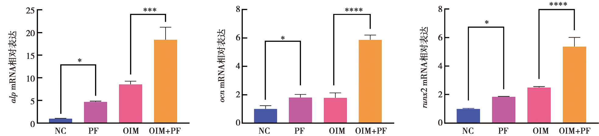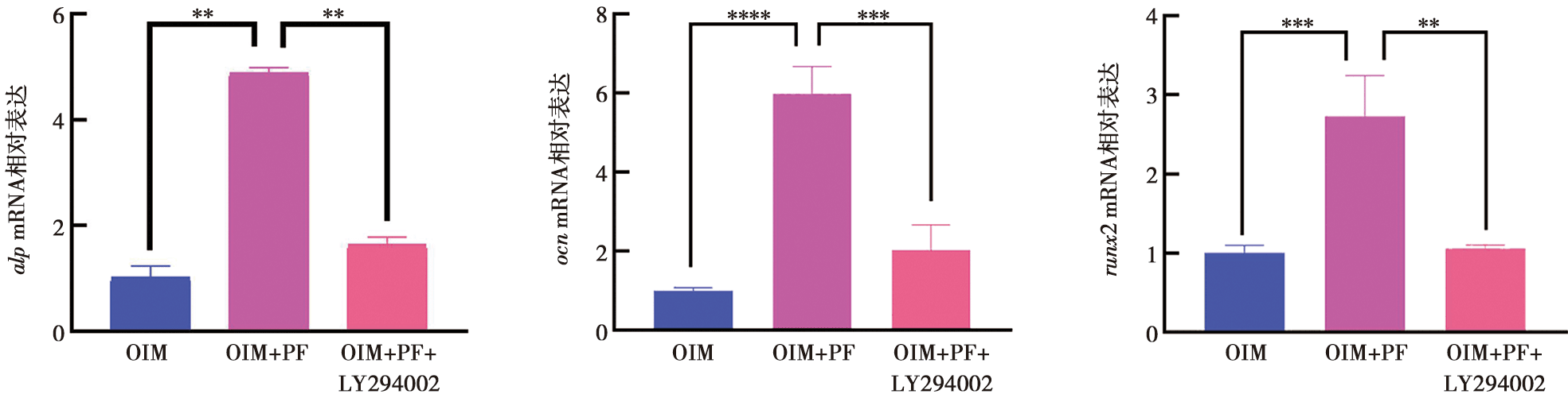 目的 探究芍药苷(paeoniflorin,PF)对人颌骨骨髓间充质干细胞(human jaw bone marrow mesenchymal stem cells,hJBMMSCs)增殖及成骨分化的影响及相关机制。方法 采用组织块法分离培养hJBMMSCs,根据实验要求进行相关条件培养,采用CCK-8法检测不同浓度(1、5、10、50、100 μmol/L)PF对hJBMMSCs增殖能力的影响;通过碱性磷酸酶(ALP)检测分析、茜素红S染色、RT-qPCR和Western blot探讨PF对hJBMMSCs成骨分化及PI3K/AKT信号通路相关蛋白表达水平的影响。结果 10 μmol/L PF显著促进hJBMMSCs增殖,而100 μmol/L PF有明显细胞毒性;其中,10 μmol/L浓度条件下hJBMMSCs各成骨相关mRNA和蛋白表达水平均明显上升,并上调p-PI3K表达水平,而PI3K抑制剂干预后,hJBMMSCs的成骨能力显著下降。结论 10 μmol/L PF可能通过调节PI3K/AKT信号通路以促进hJBMMSCs的成骨分化。