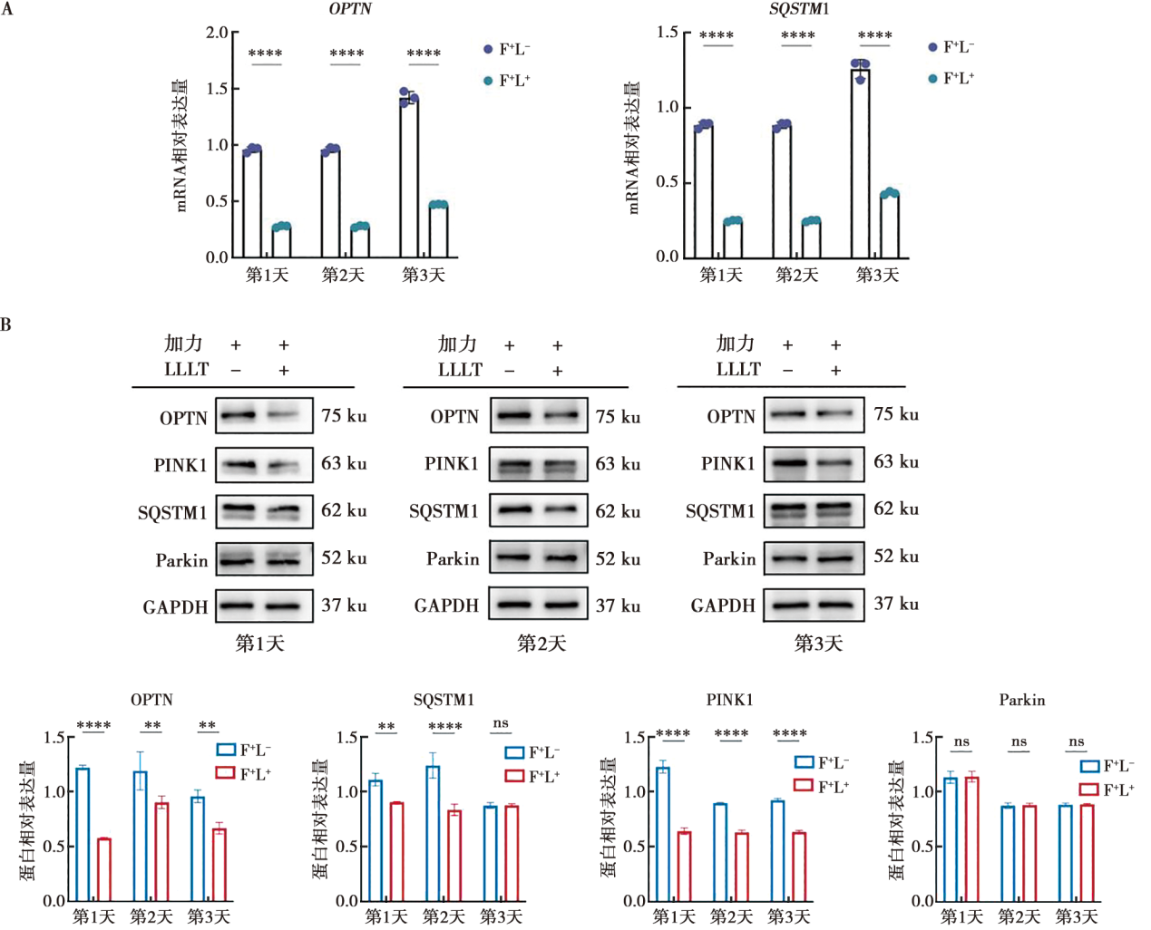 目的 探究低水平激光治疗(low-level laser therapy,LLLT)对正畸牙齿移动速度的影响及机制。方法 构建大鼠牙移动与低水平激光治疗模型,通过Micro-CT比较LLLT辅助正畸加力组(F+L+组)大鼠与单纯正畸加力组(F+L-组)大鼠第一磨牙近中移动距离。构建THP-1细胞压力与激光照射模型,通过mRNA测序分析F+L+组和F+L-组THP-1细胞的差异表达基因并进行富集分析,并通过qRT-PCR、蛋白免疫印迹实验测定通路相关基因及标志物的表达变化。结果 F+L+组大鼠上颌第一磨牙近中移动距离比F+L-组显著增加(P<0.05);F+L+组THP-1相较F+L-组THP-1差异基因显著富集于线粒体自噬通路,qRT-PCR及蛋白免疫印迹实验验证F+L+组THP-1的线粒体自噬相关基因OPTN、SQSTM1表达水平较F+L-组THP-1降低,同时其线粒体自噬通路关键标志物PINK1/Parkin也下降。结论 低水平激光治疗可能通过抑制线粒体自噬通路加速正畸牙移动。
