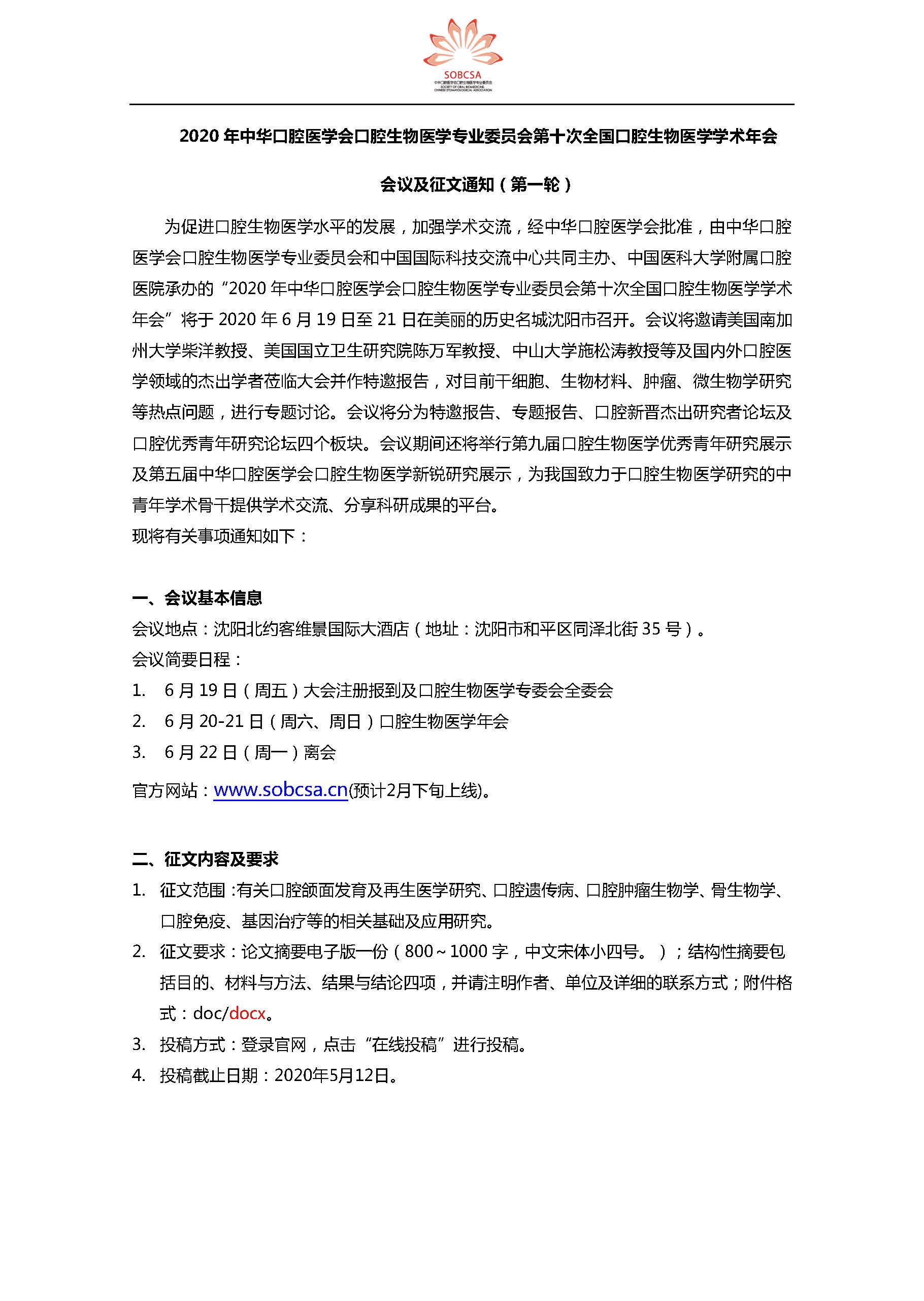 2020年中华口腔医学会口腔生物医学专业委员会第十次全国口腔生物医学学术年会暨第六次全国口腔杰青优青论坛 会议及征文通知(第一轮)