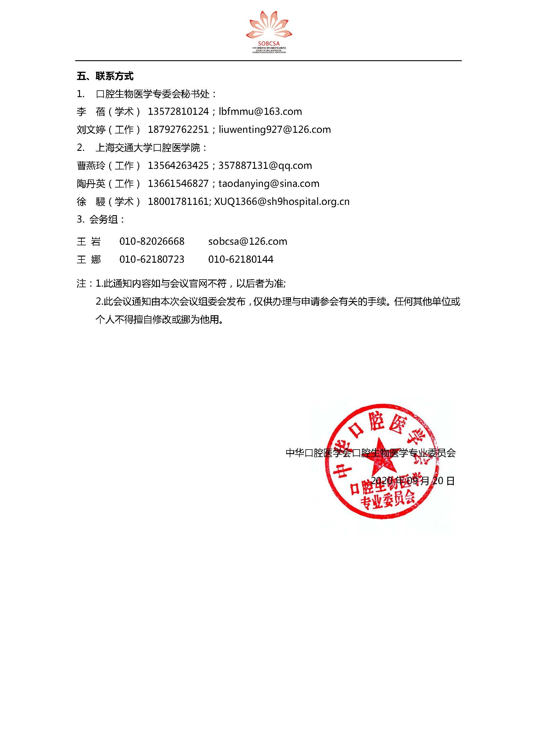 2020年中华口腔医学会口腔生物医学专业委员会第十次全国口腔生物医学学术年会暨第六次全国口腔杰青优青论坛 会议及征文通知(第一轮)